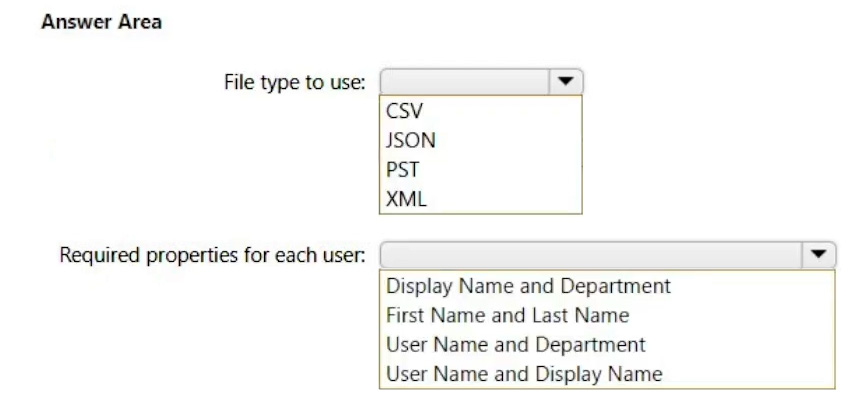Which type of file should you use and which properties are required? To answer, select the appropriate options in the answer area.