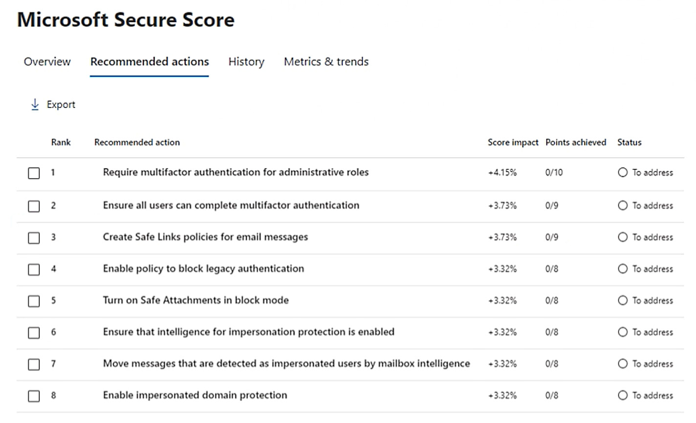 Your company’s Microsoft Secure Score recommends the actions shown in the following exhibit.