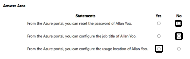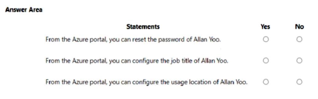 An on-premises Active Directory user account named Allan Yoo is synchronized to Azure AD. You view Allan’s account from Microsoft 365 and notice that his username is set to Allan@adatum.onmicrosoft.com.