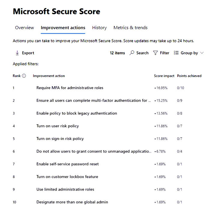 The Microsoft Secure Score for the tenant is shown in the following exhibit.