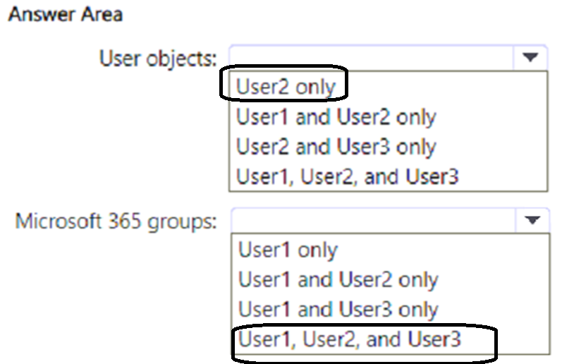 Which users can create user objects, and which users can create Microsoft 365 groups? To answer, select the appropriate options in the answer area.