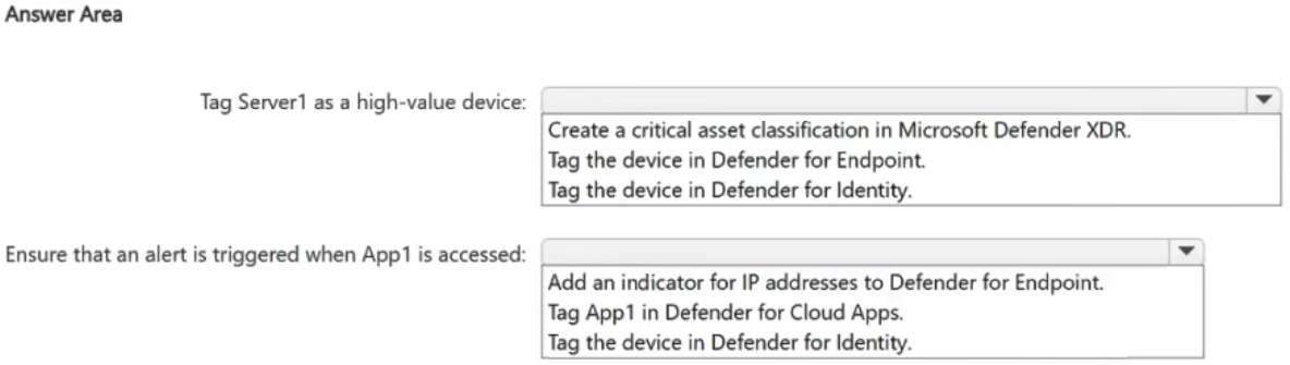 You have a Microsoft 365 E5 subscription and use Microsoft Defender for Cloud Apps, Microsoft Defender XDR, Microsoft Defender for Endpoint, and Microsoft Defender for Identity. You configure Cloud Discovery for App1 and Server1.
