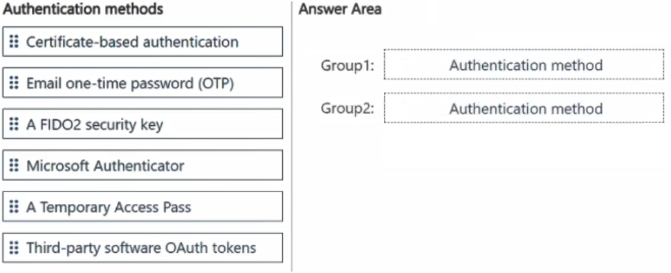 Which authentication method should you recommend for each group? To answer, drag the appropriate methods to the correct groups. Each method may be used once, more than once, or not at all. You may need to drag the split bar between panes or scroll to view content.