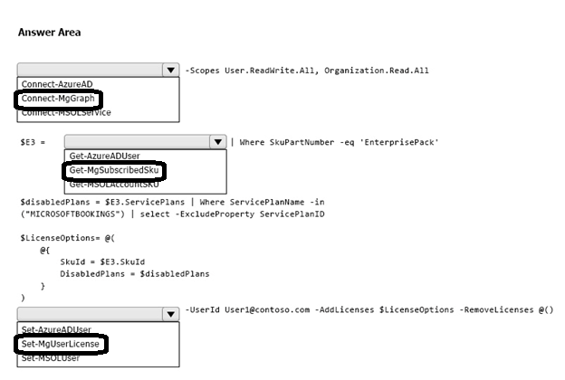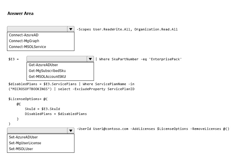 You need to use PowerShell to assign a Microsoft Office 365 E3 license to User1. Microsoft Bookings must NOT be enabled.